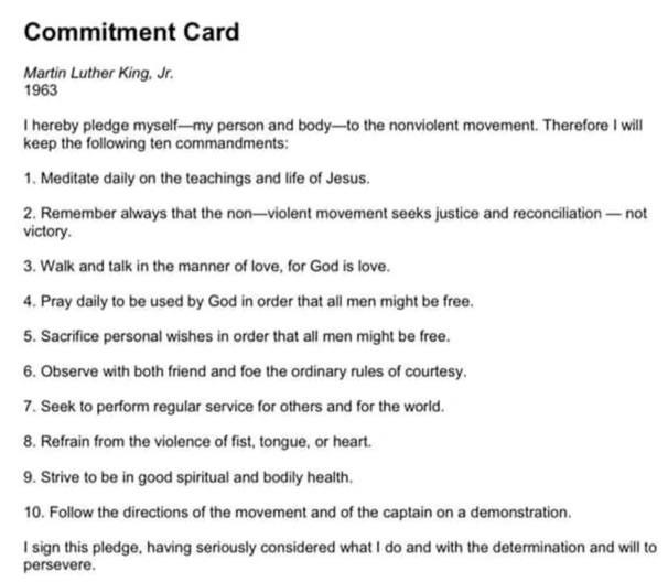 Then this image: plain text, no branding, no algorithms trying to seduce me with a fight. A simple heading—“Commitment Card.” A date—1963. Ten “commandments” Martin Luther King Jr. asked ordinary people to pledge themselves to as part of the nonviolent movement.