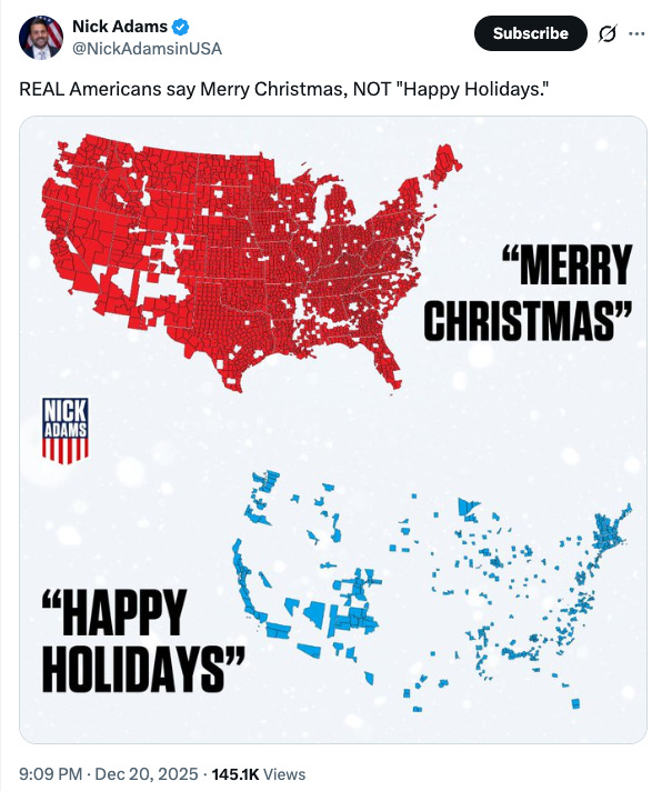 Because let’s be honest about what’s packed into a tweet like Adams’s: “Merry Christmas” isn’t being offered as a blessing; it’s being wielded as a boundary marker.