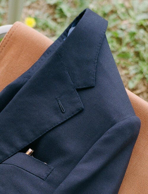 A navy hopsack is the closest thing menswear has to a Swiss Army knife. It’s one of the easiest, most forgiving pieces of clothing you can buy. Dress it up with a tie. Dress it down with denim. Wear it with an OCBD, a polo, or a simple tee. It looks “put together” without looking like you’re auditioning for anything.